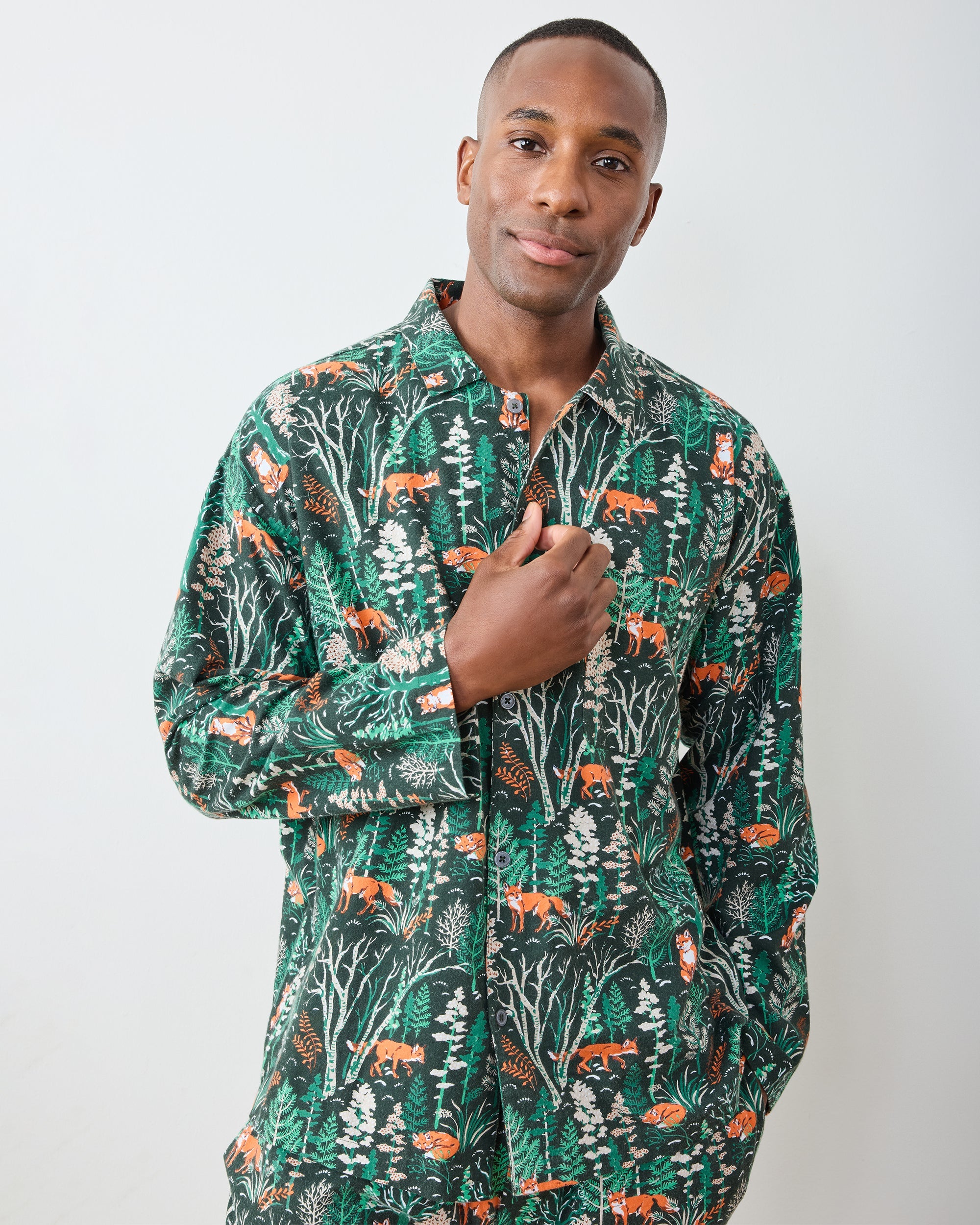 Settle into your own woodland tale with our Fox & Folklore men's flannel pajamas in Juniper. This storybook-inspired flannel pajama set features whimsical foxes wandering through enchanted forests on soft. organic flannel. The roomy button-down top and relaxed-fit pants with pockets create the perfect men's PJs for gifting and relaxing all season long. Discover more hand-drawn prints in flannel styles and men's sleepwear.