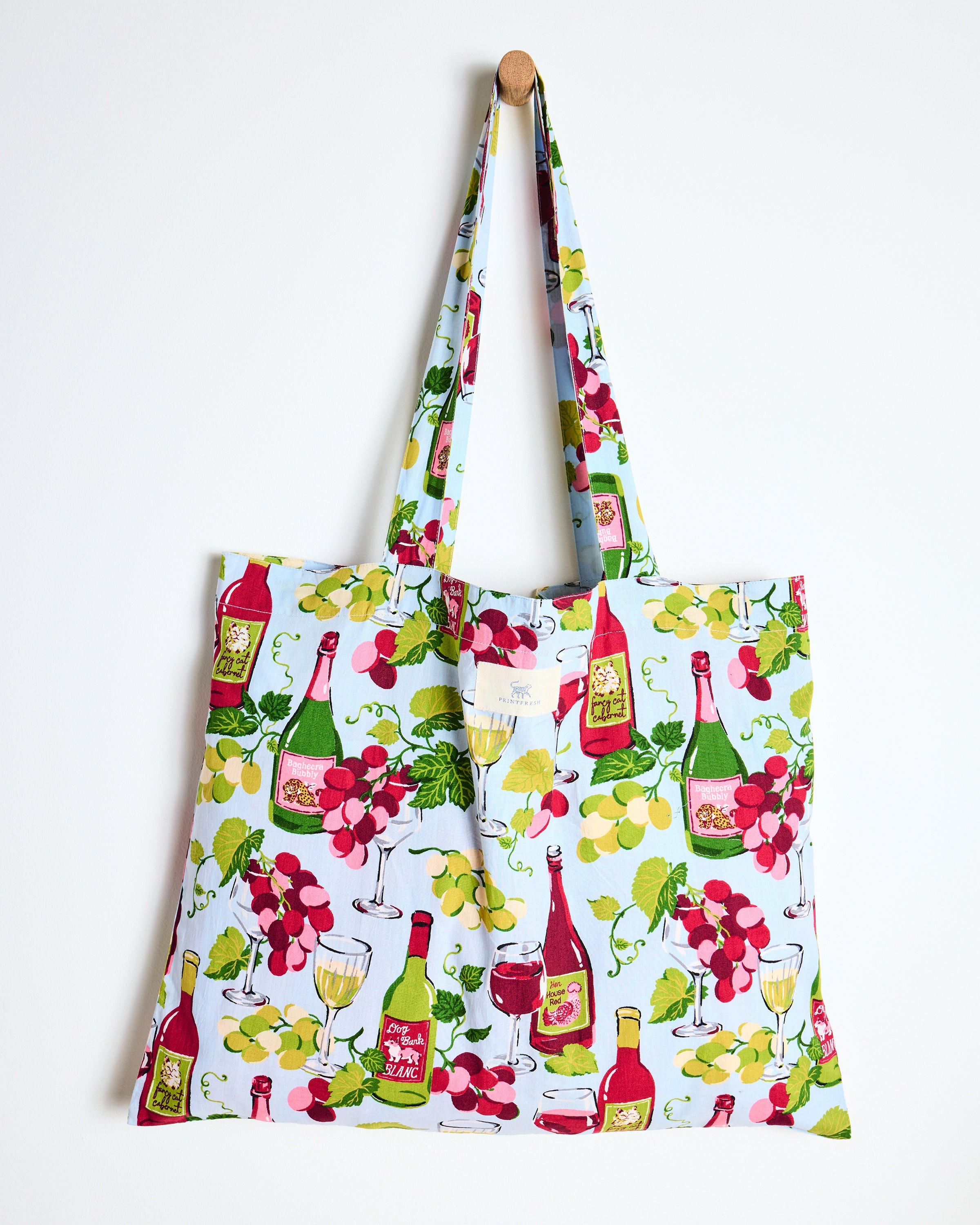 Toast to effortless style with our Wine Club go-to-tote in Vineyard Sky. This roomy cotton shoulder bag features playful wine labels inspired by past Printfresh favorites. perfect for farmers market runs or weekend wine tastings. The spacious design easily holds your everyday essentials. while the wine print tote adds personality to any outing. Shop more bags. accessories. and pouches.